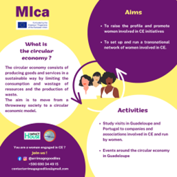 Le projet Mica : promouvoir le rôle des femmes dans l’Économie Circulaire (EC) pour construire un monde sans déchets !”” repose sur le constat selon lequel nombreuses sont les femmes implantées en Guadeloupe (RUP) et au Portugal (Lisbonne) qui exercent une activité formelle et informelle dans de l’EC peinent à accéder à une autonomie économique et à un leadership alors qu’elles apportent une contribution majeure à l’EC, car souvent porteuses d’initiatives innovantes au profit de leurs communautés.